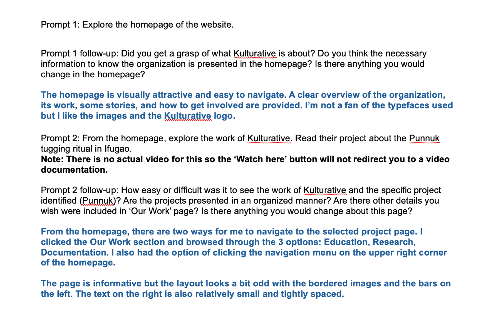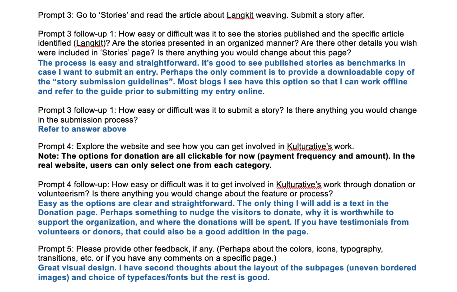 During testing, users gained a clear understanding of Kulturative’s mission and described the site as “easy to navigate,” “straightforward,” and “visually attractive." Once the website goes live, it has the potential to become a trusted go-to source for those seeking to engage with Philippine culture, empowering users to explore cultural stories, connect with ongoing initiatives, and participate in future collaborations. The platform’s intuitive design and engaging visuals could foster deeper awareness, encourage storytelling contributions, and increase community-driven cultural preservation.