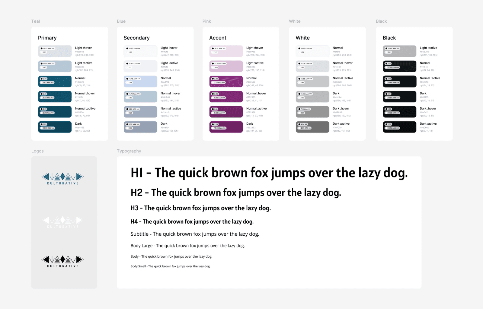 I created a simple design system for Kulturative in line with its brand book. Below are its logo, color palette, typography, and some design components.