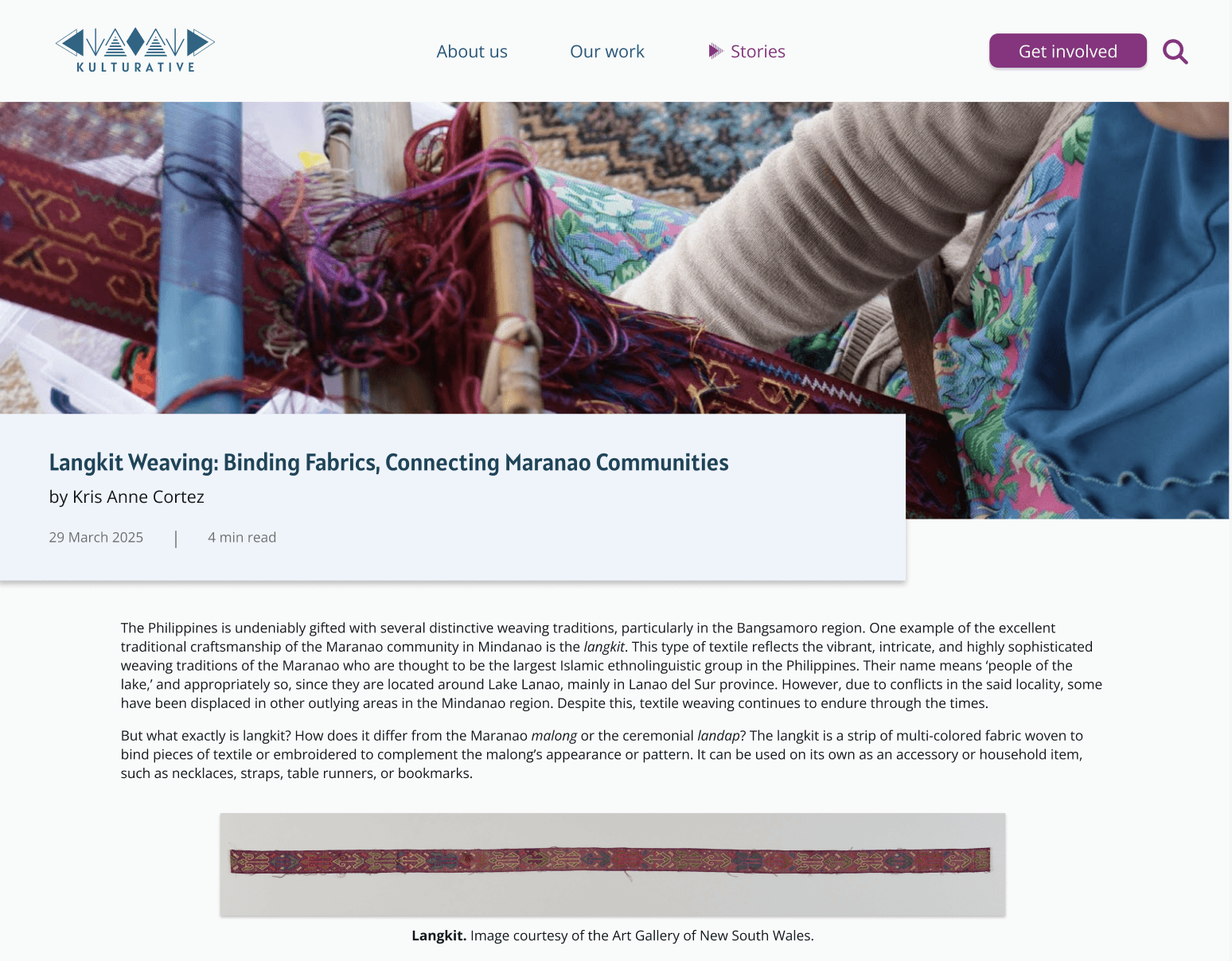 Kulturative, Inc. is a non-profit cultural organization based in the Philippines. Their mission is to empower grassroots cultural communities and safeguard intangible cultural heritage through education, research, and documentation.